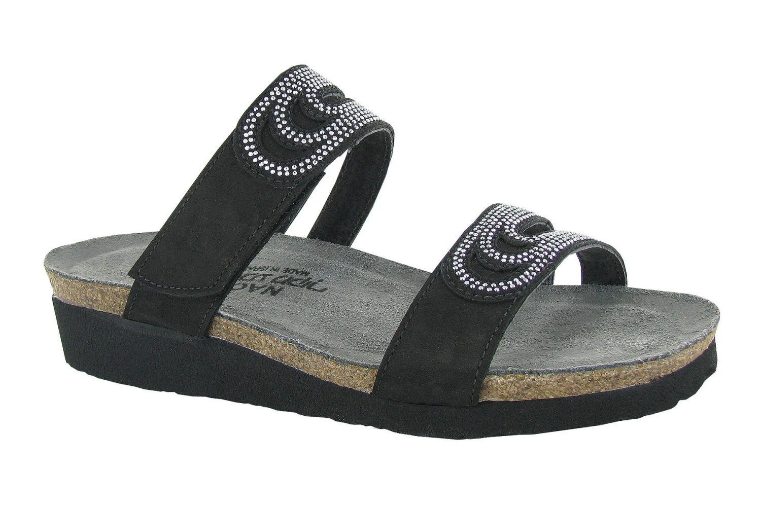 Warm weather comfort is delivered in the women’s Naot Ainsley sandal. The leather upper features an adjustable hook and loop closure for a customized fit. The cushioned, cork and latex footbed absorbs shock and supports the foot from heel to toe, while the durable rubber outsole provides traction and stability.