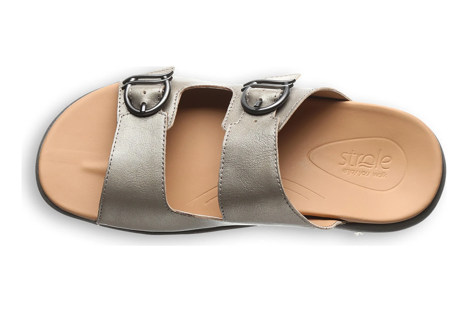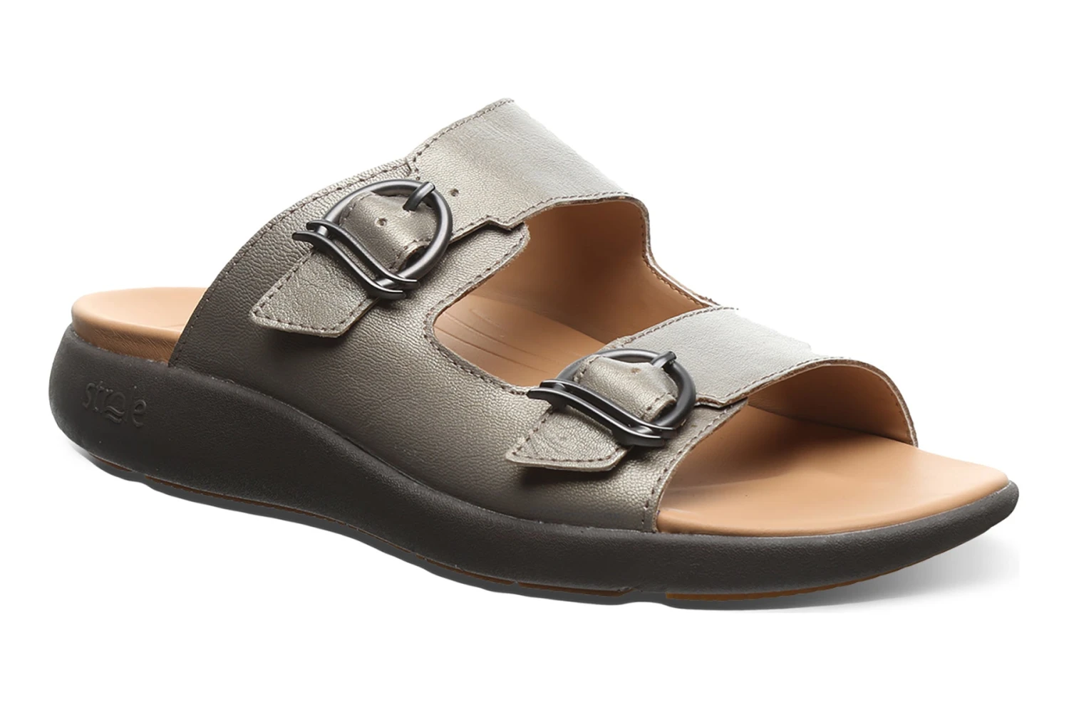Strole Coral is a timeless slide sandal designed for comfort. Features include dual buckle leather straps and uppers, sheep leather footbed and EVA outsole. These stylish slip-on sandals have a Soft Stride support system and assist with arch support, impact reduction and rebound cushioning.