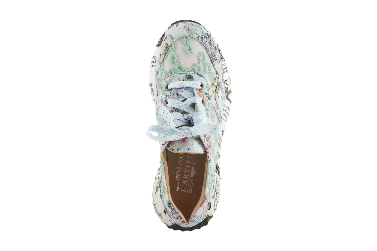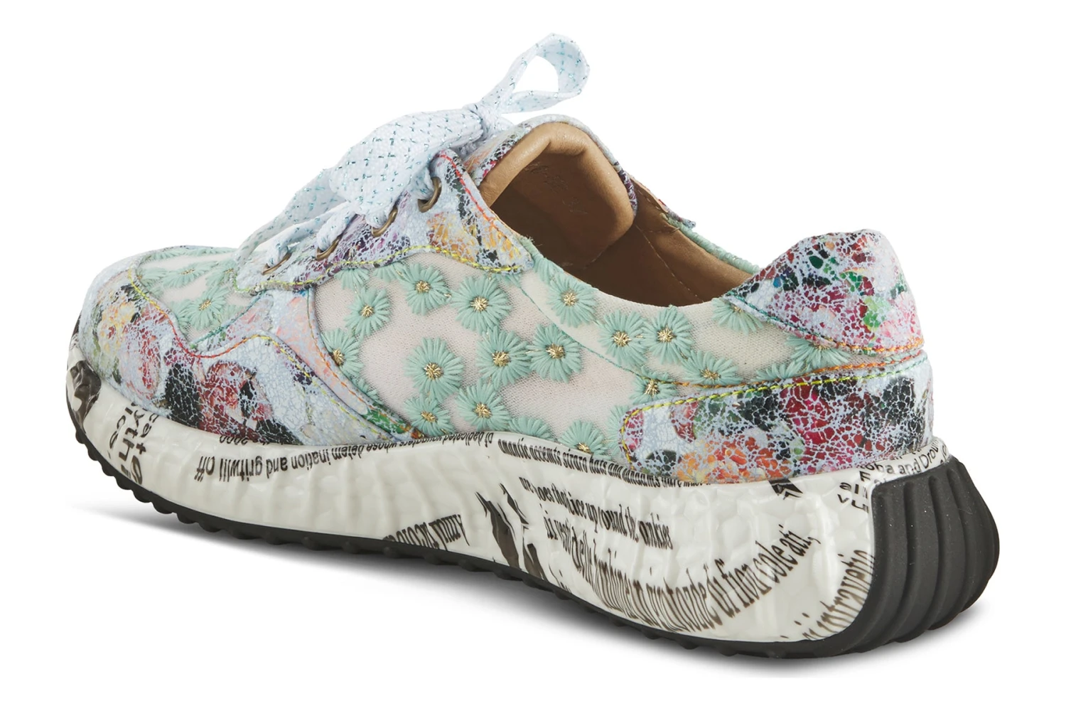 Push yourself out of your comfort zone with these Daisymae sneakers. Following the shoe are daisies and handpainted crackle floral patterns. The newspaper drop heel outsole and metallic laces spice up this sneaker.