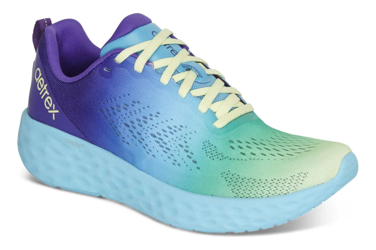 Aetrex Danika is a mesh sneaker with great arch support, thick UltraSky cushioning and adjustable laces. A padded collar and tongue provides extra comfort. A removable insole adds support, while rubber pods on the outsole offer traction and durability.