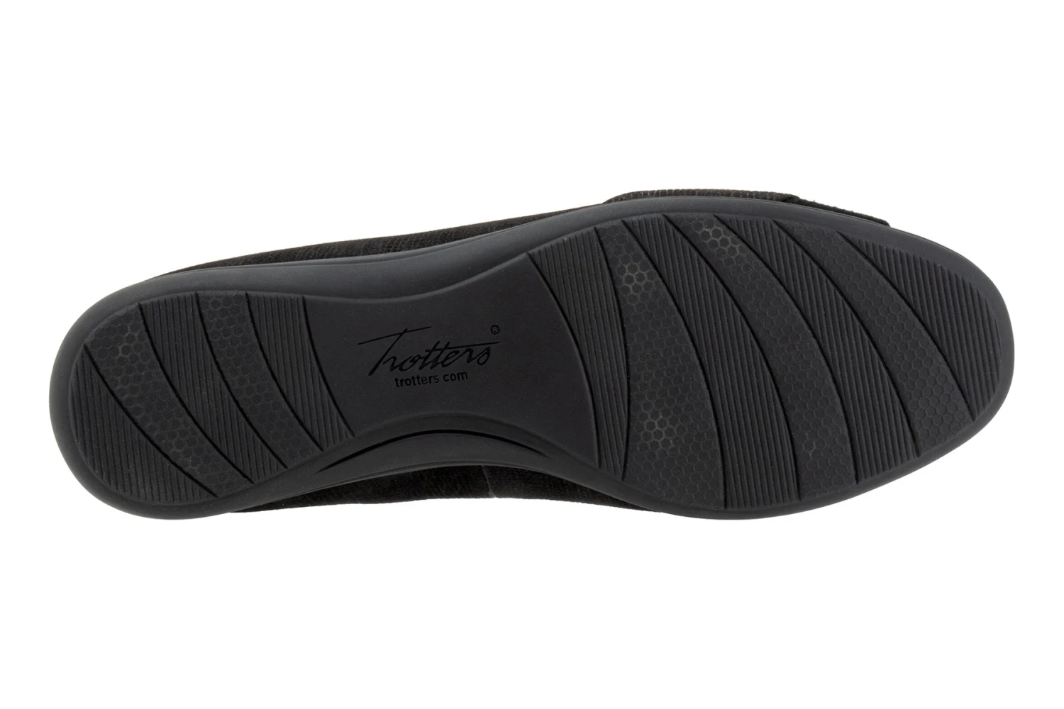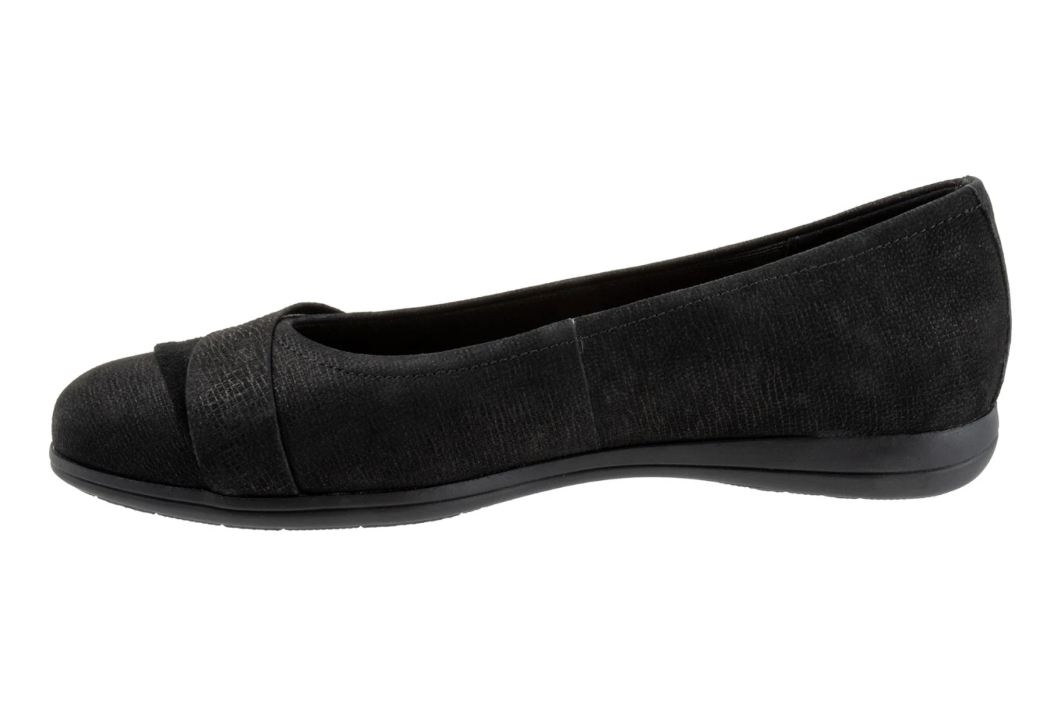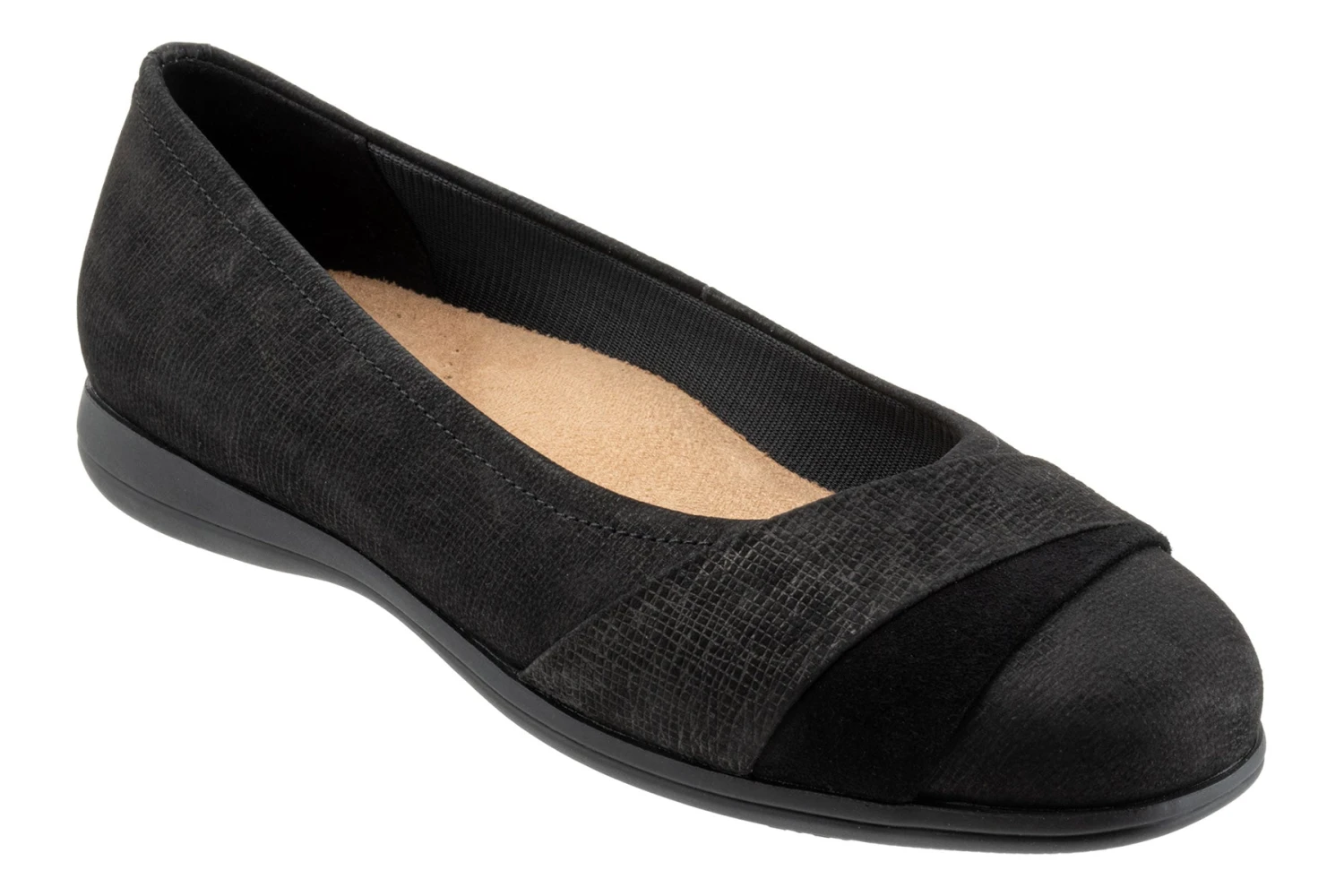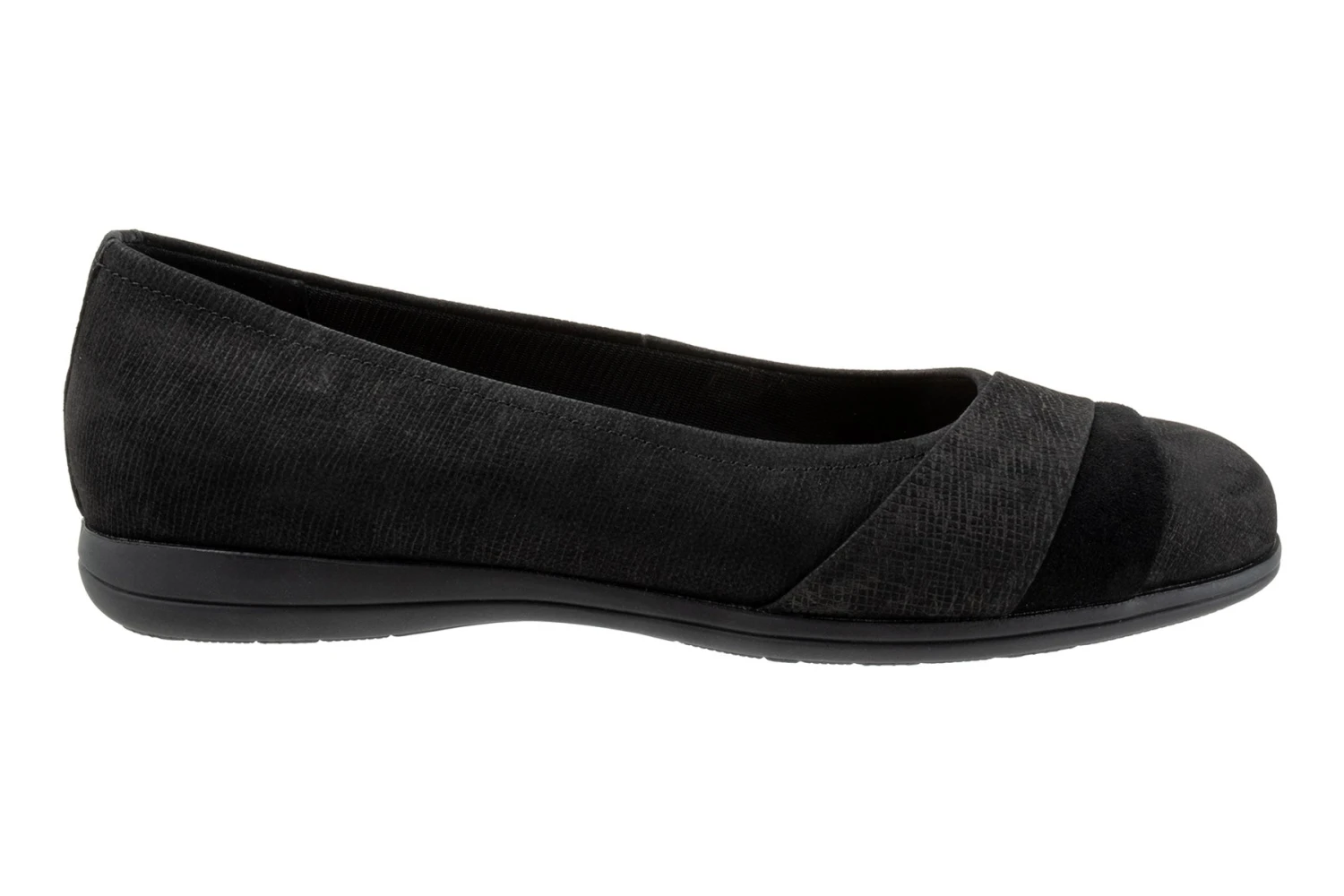 Danni is an essential flat with mixed materials and asymmetric detailing. A grippy rubber sole and removable cushioned footbed with arch support make for all day comfort.