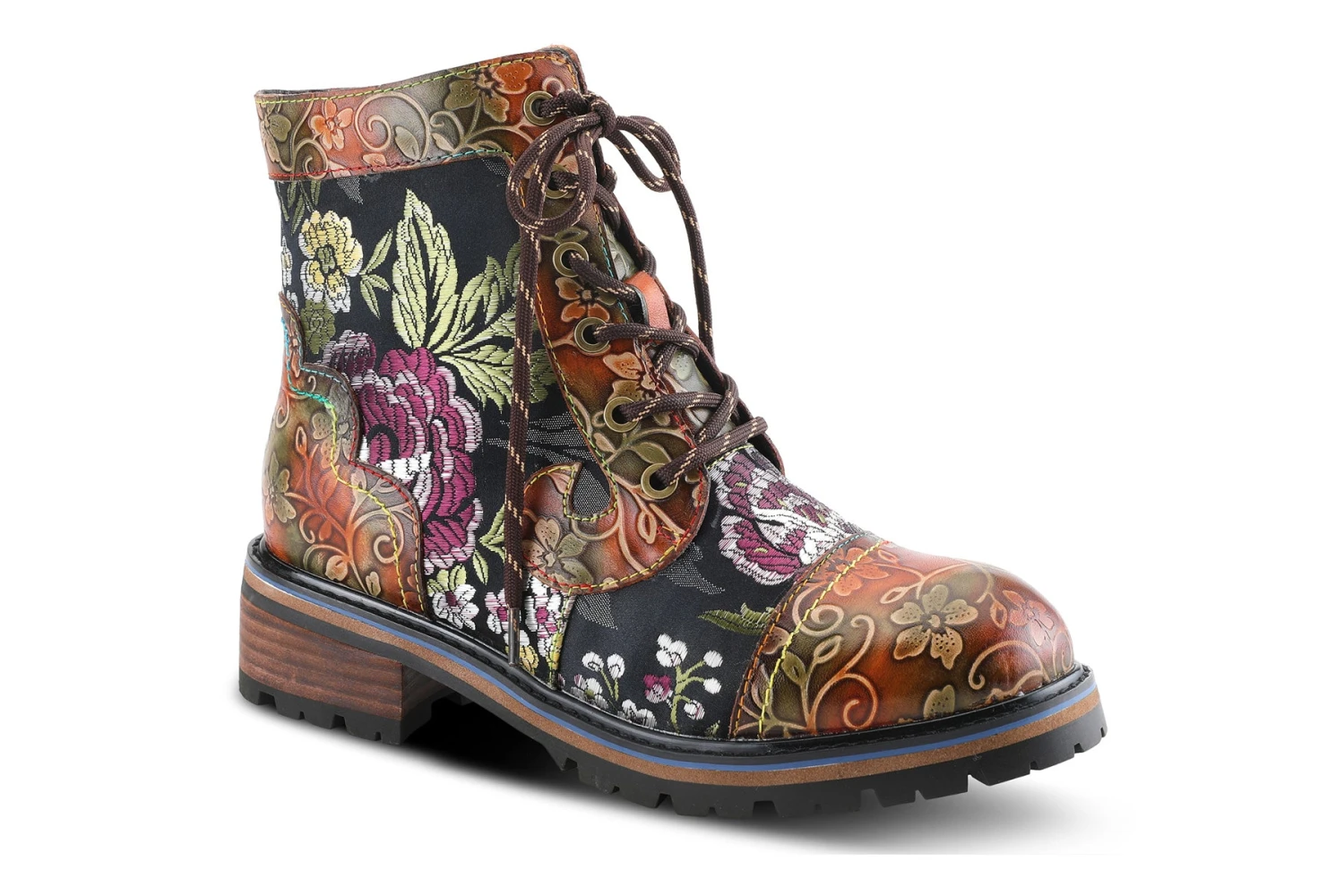 L`Artiste FANTASTIC Incredible leather combination bootie showing an embroidered textile and embossed floral leather on a comfort lug sole.