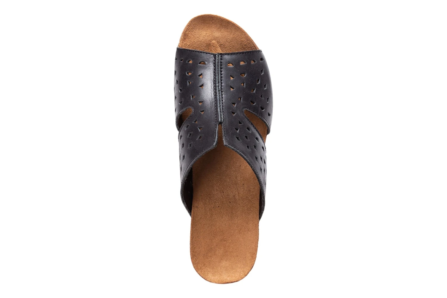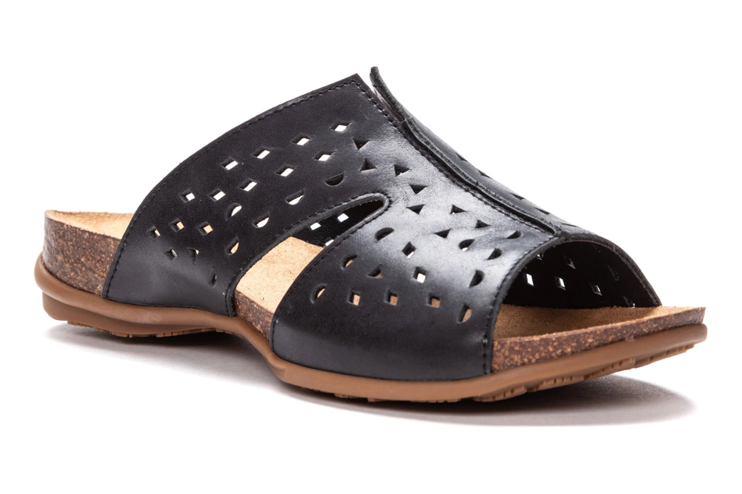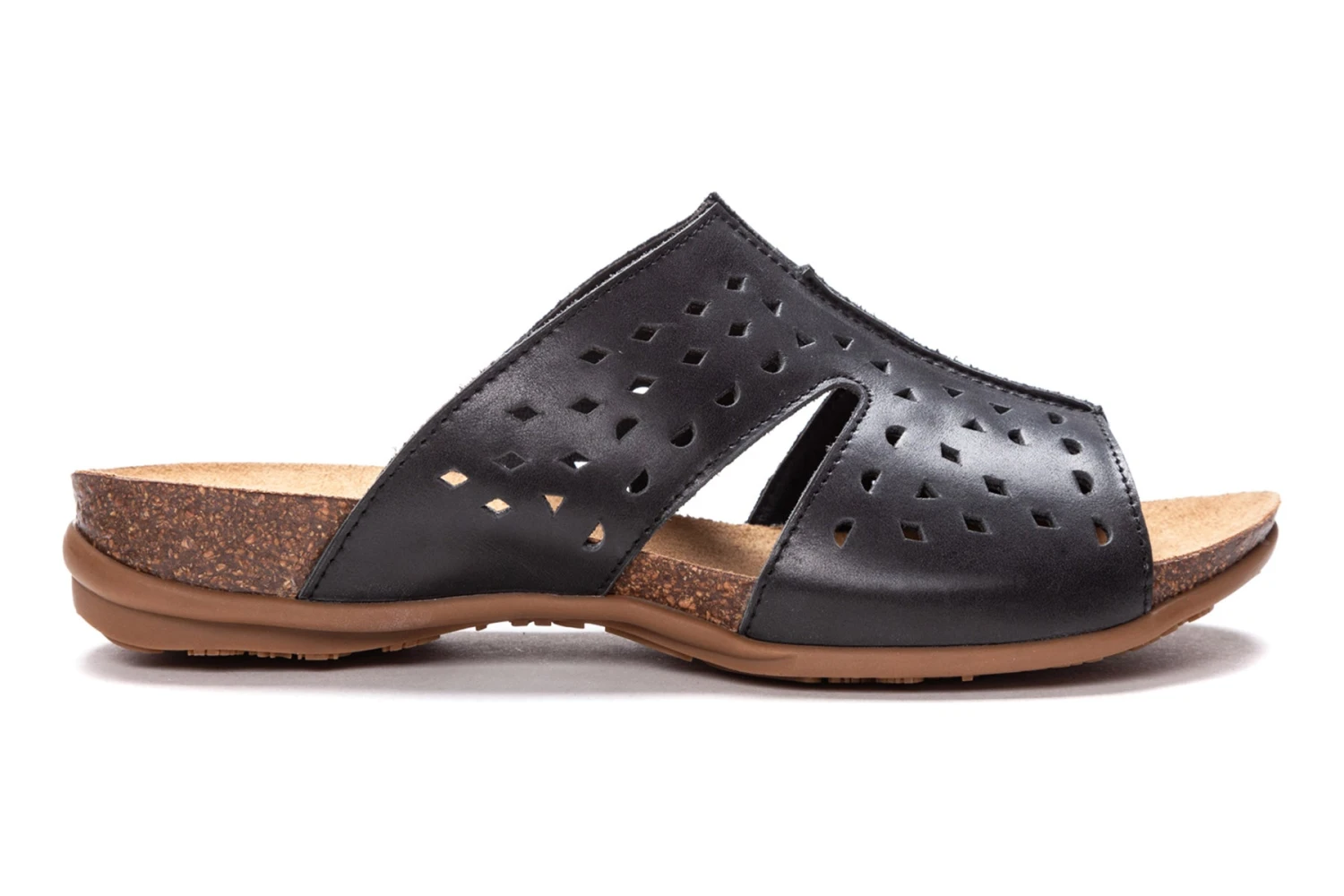 Soft leather slide sandal with decorative cut-outs. Cushioning cork and rubber combine for durable wear and lasting walking comfort. Shank-reinforced rubber outsole for extra grip and traction on any surface.
