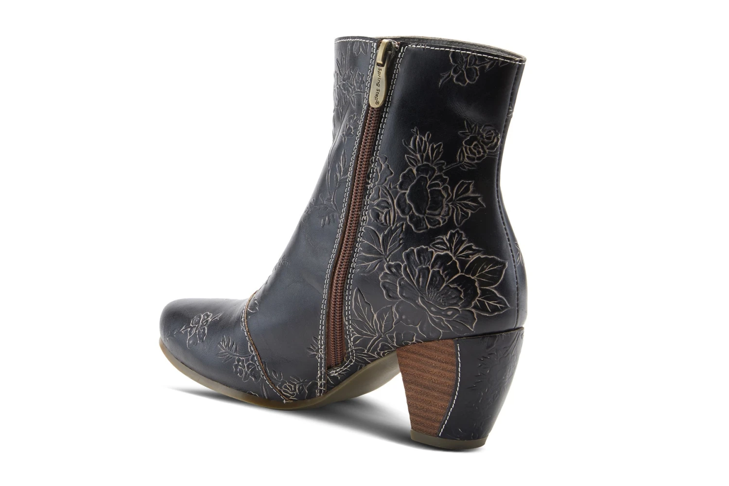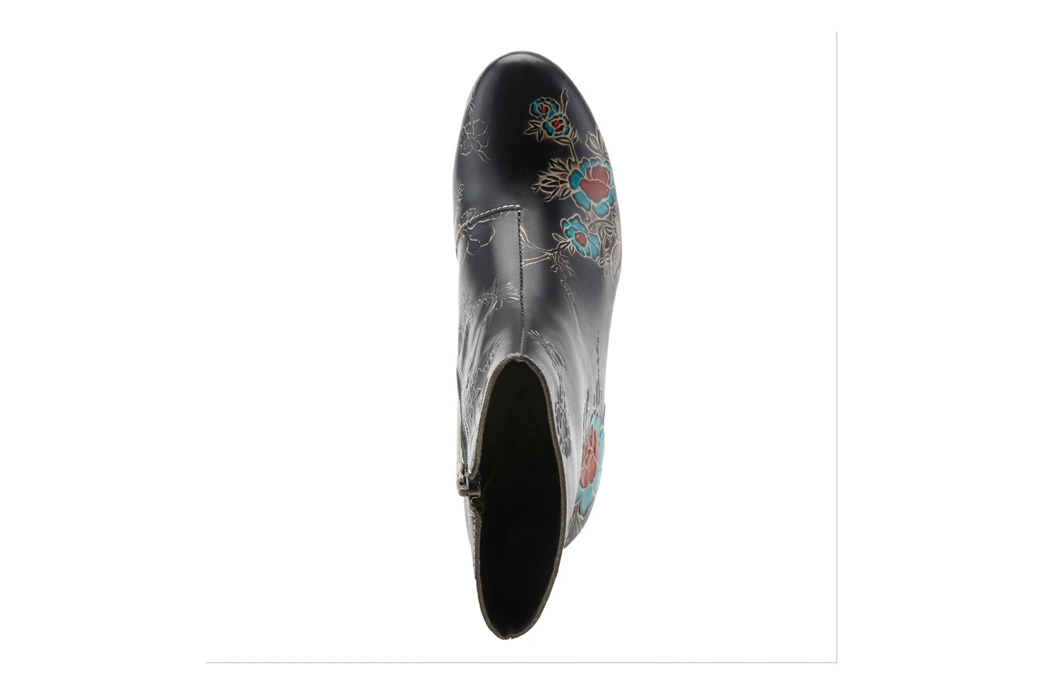 L`Artiste Style: Folka -Premium genuine leather boots with embossed multi color floral details, an inside zipper for easy on and off on a stacked curvy heel with leather piece on the back.