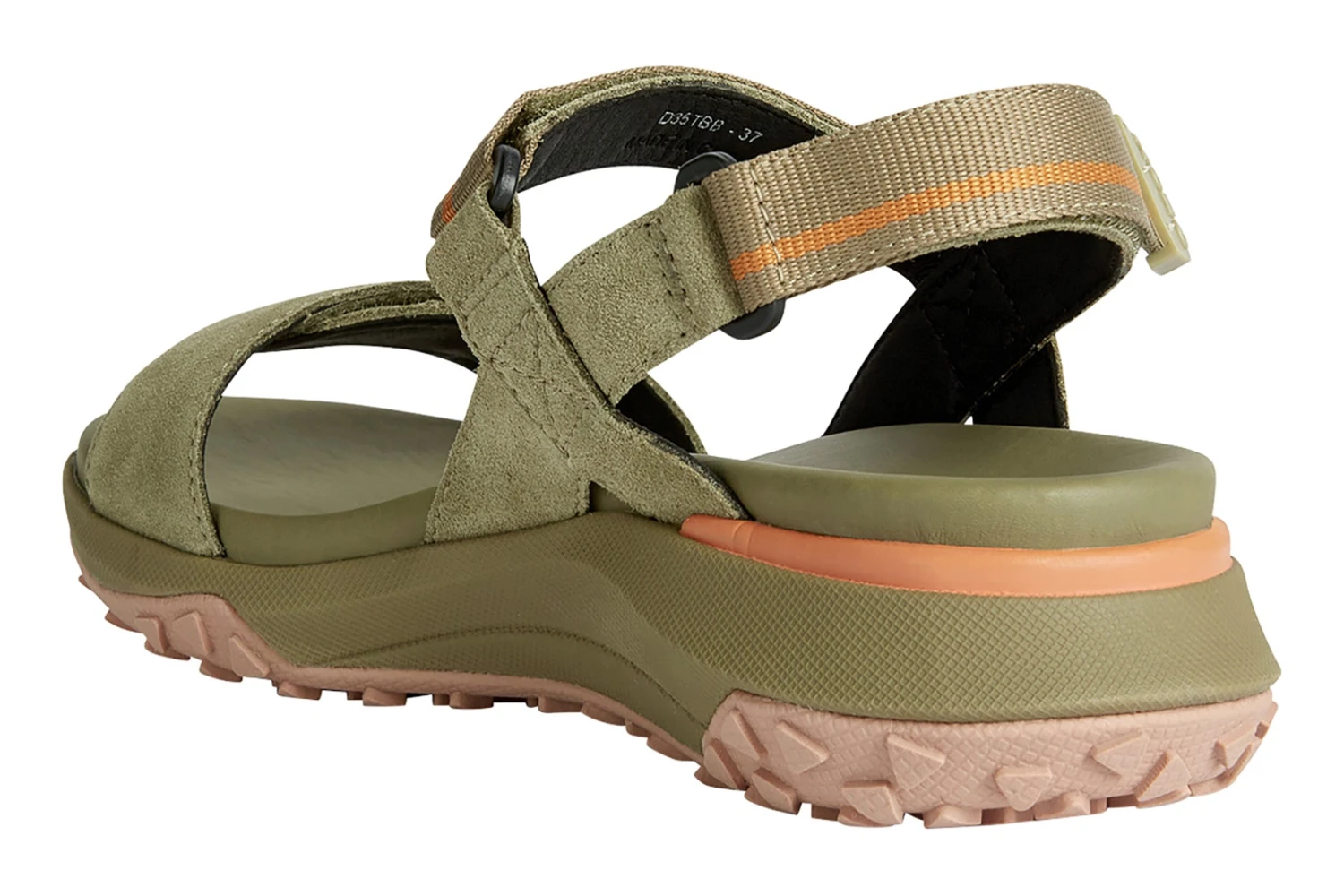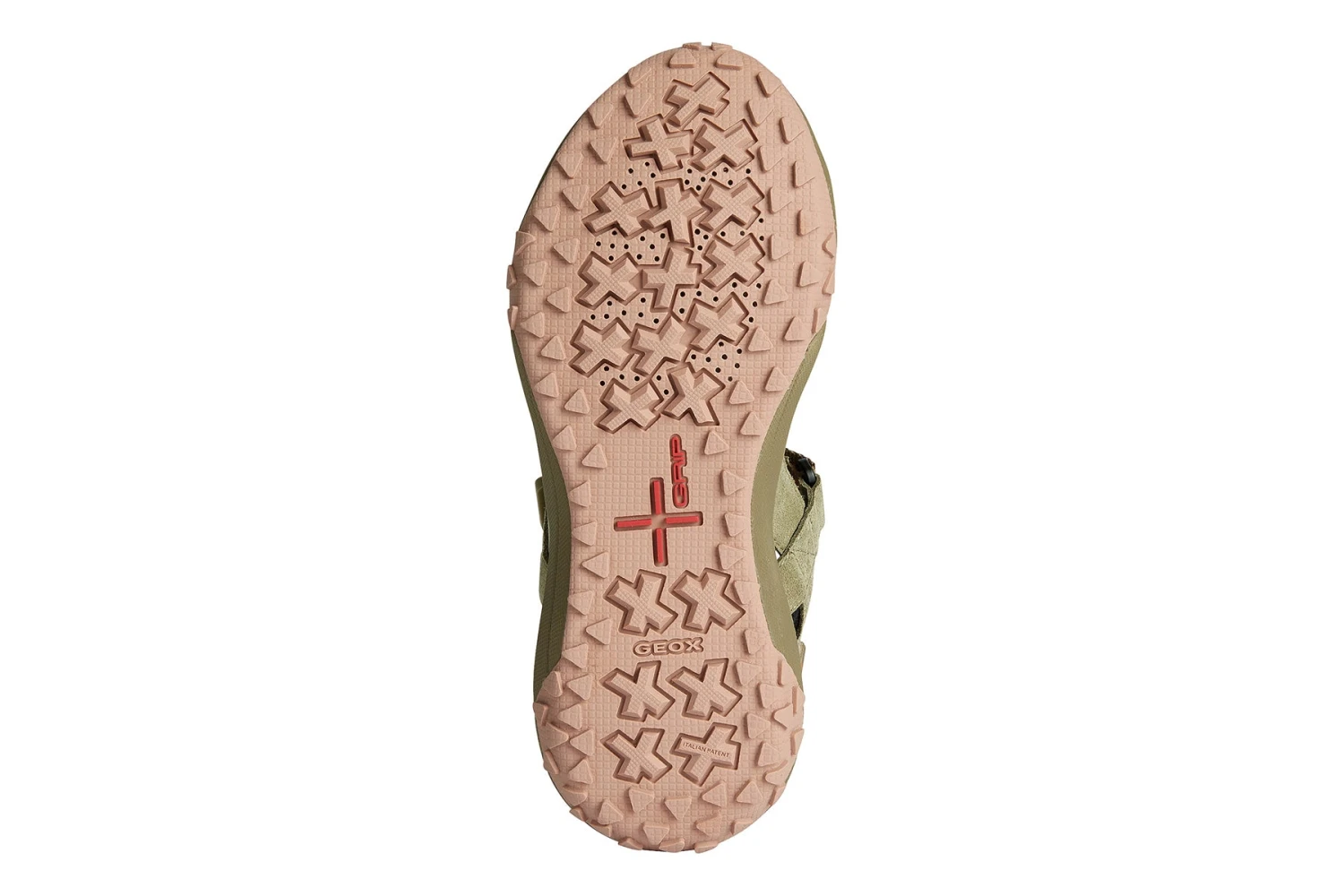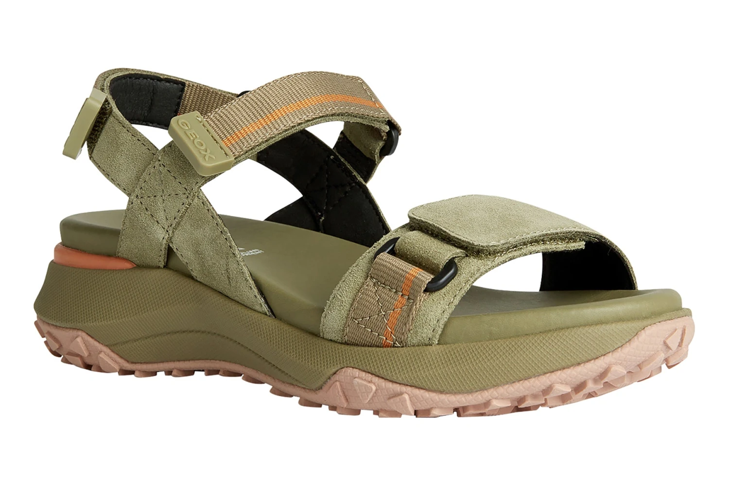 Comfortable breathable GEOX Sorapis + Grip sandals for women with an outdoor vibe and urban contemporary aesthetic. This attractive version features an upper crafted from suede and fabric in a pistachio-green shade. Set on a comfortable gripping outsole, Sorapis + Grip is the perfect way to energize everyday dressing with an active note and will be just the solution for long walks in the countryside.