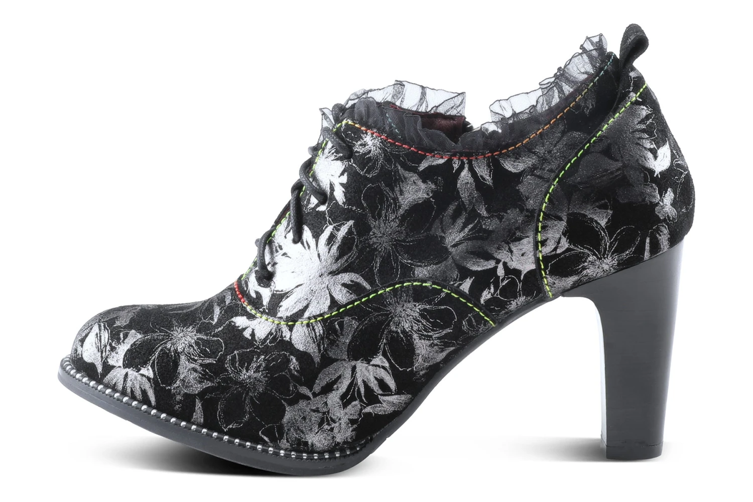 L`Artiste Style: Glitzish -Unique printed genuine suede shootie with feminine pleated tulle design, an inside zipper and Lace-up closure for adjustability and easy on and off on an elegant stacked heel, and bracelet inspired welt design.