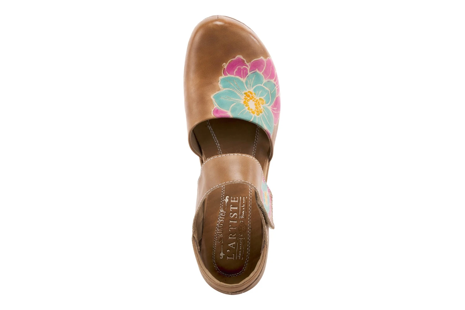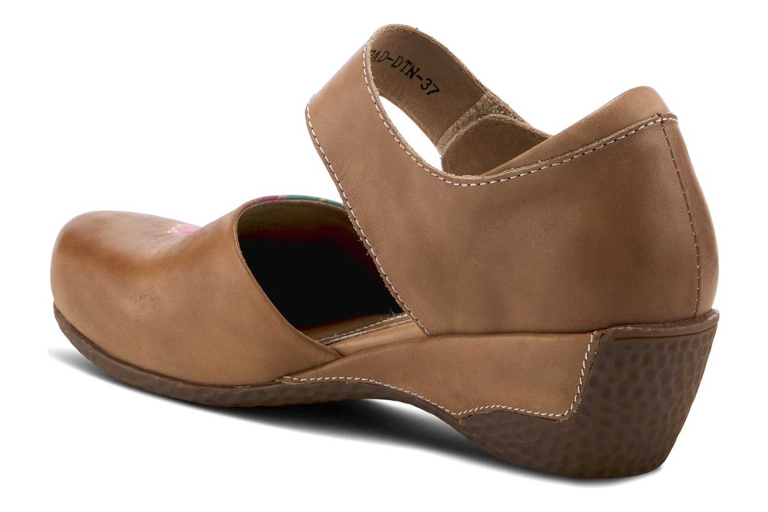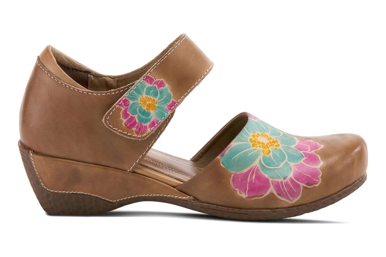 French inspired hand painted leather mary jane shoe boasts a beautiful lily flower delicately placed on the upper and top strap and features a wide adjustable strap with hook and loop fastening all on a comfort wedge sole.