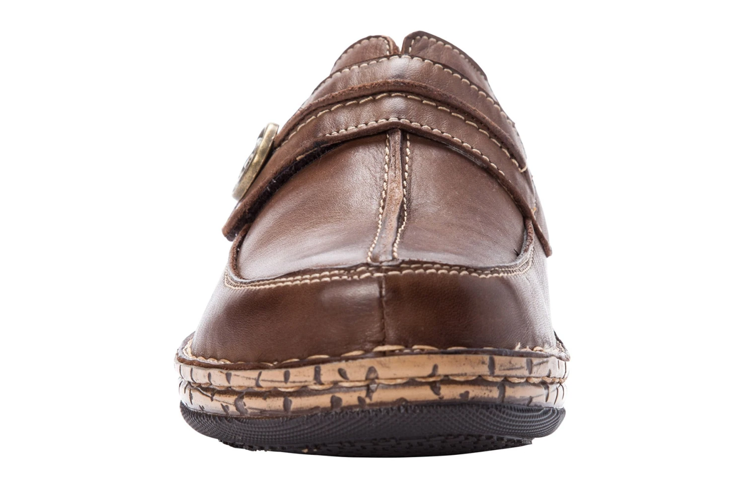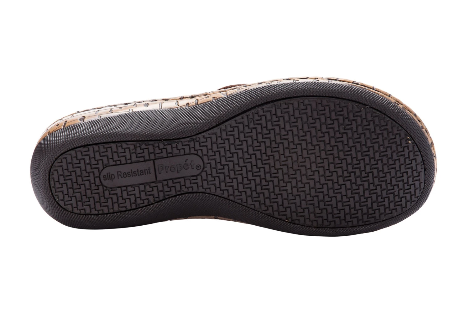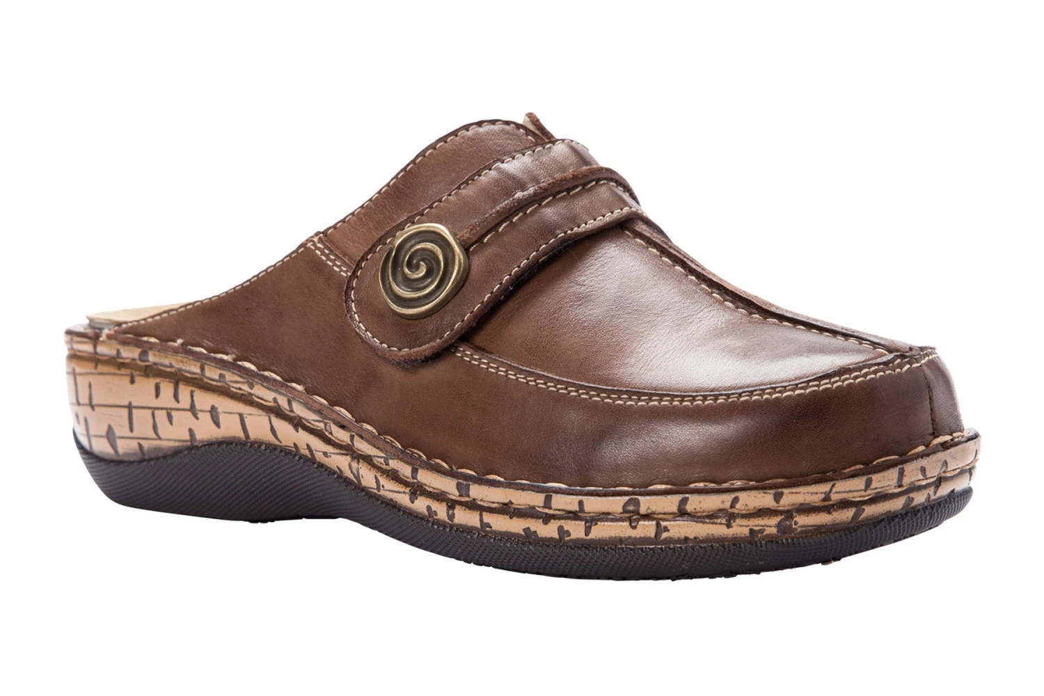 Slide into the women’s Propet Jana clog and experience all-day comfort. The full-grain leather upper is adorned with a decorative strap for added style. The removable OrthoLite® footbed accommodates custom orthotics, while the durable polyurethane outsole provides traction.