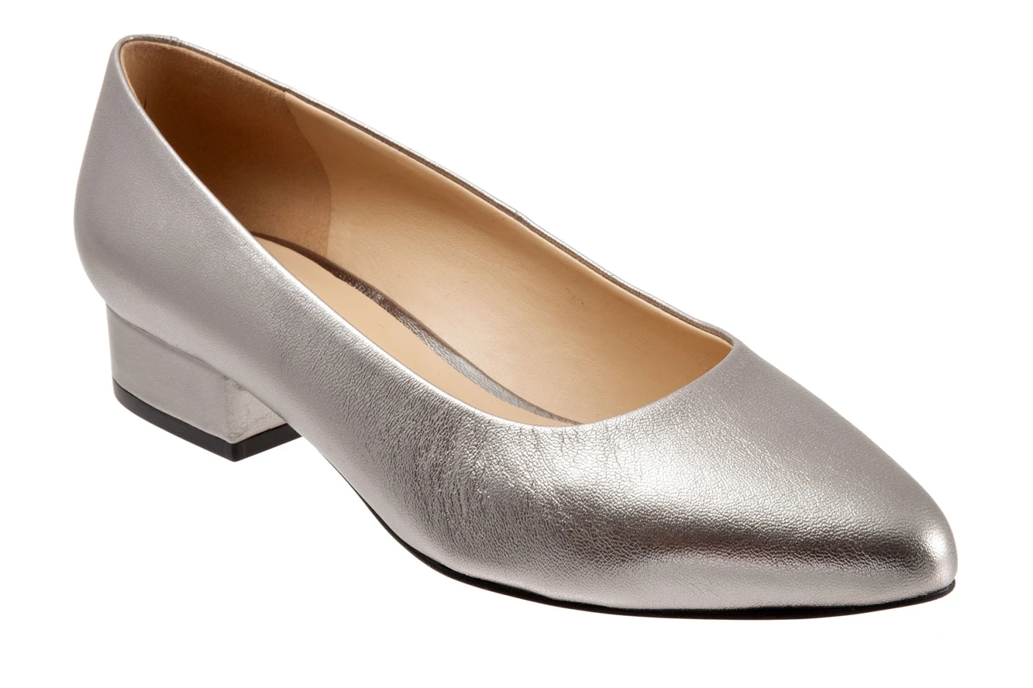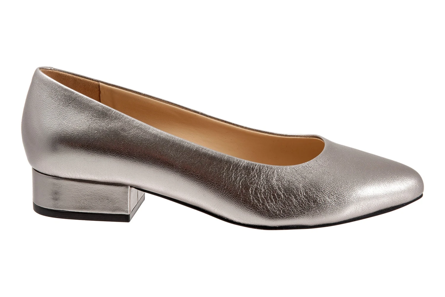 Trotters Jewel is a traditional pump on a mid block heel. Features include leather uppers, memory foam footbed, rubber outsole and 1 ¼ inch heel height. An almond toe adds elegance, while a man-made lining and insole offers support and stability.
