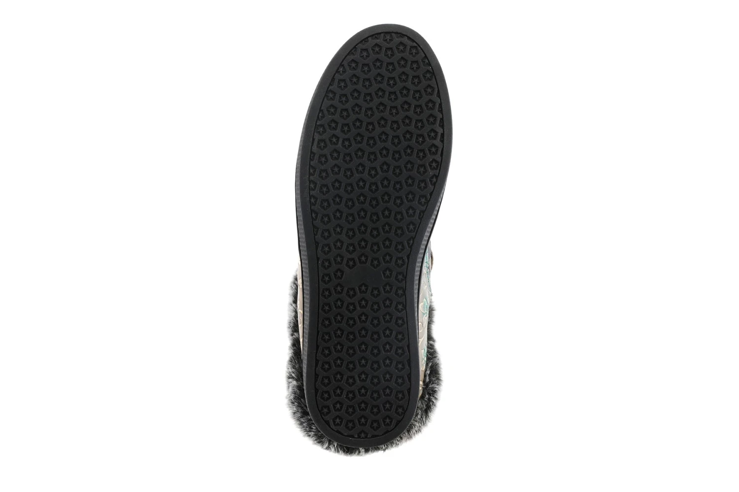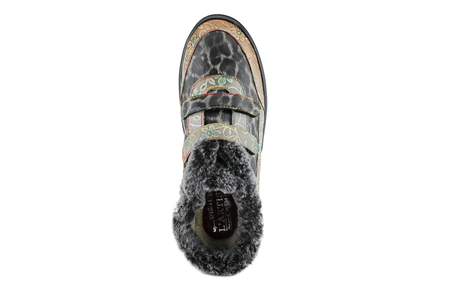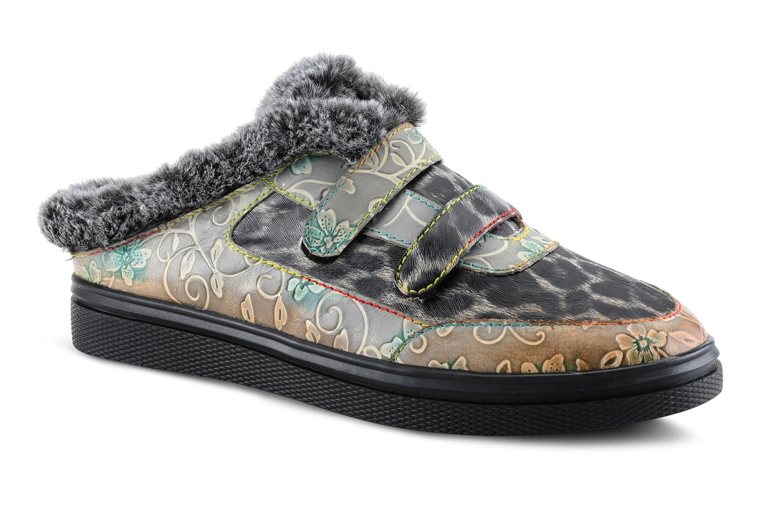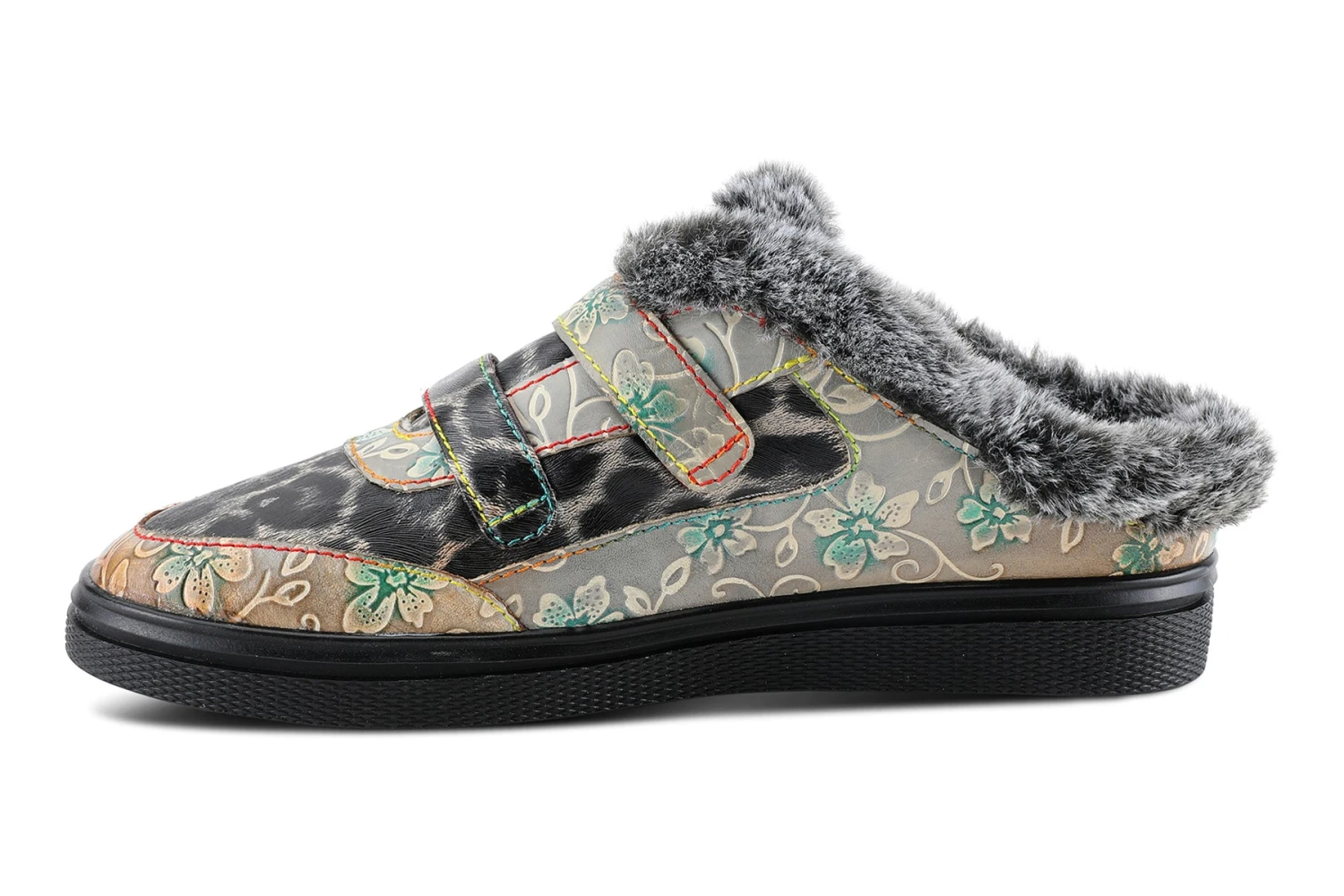 L`Artiste LAMYA Indoor/outdoor slipper featuring an animal print trimmed in an embossed floral print and plush faux-fur with cozy lining on a flexible, comfortable sole.