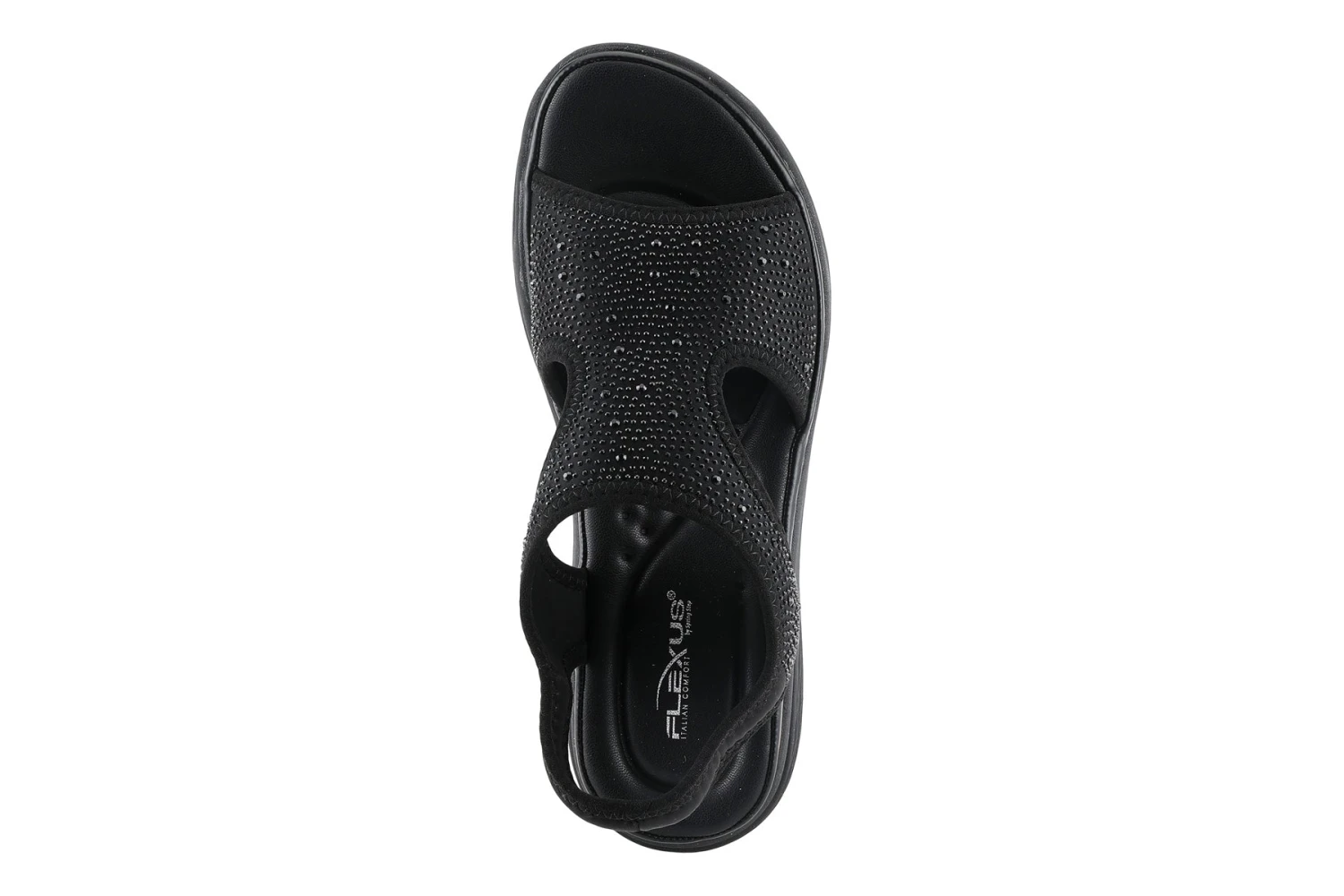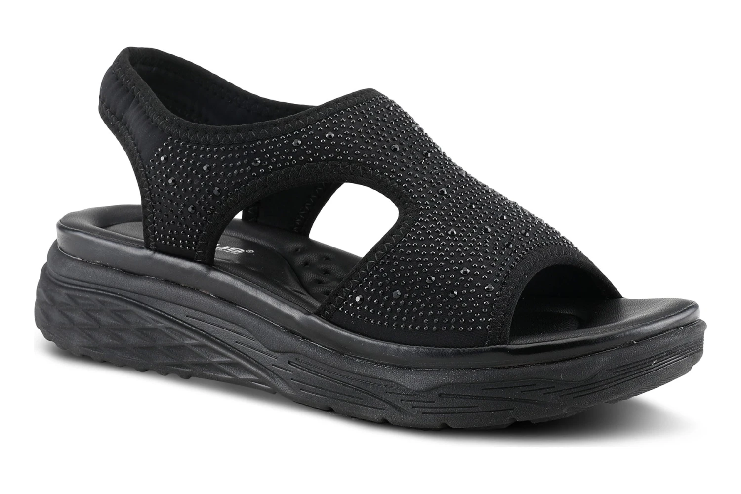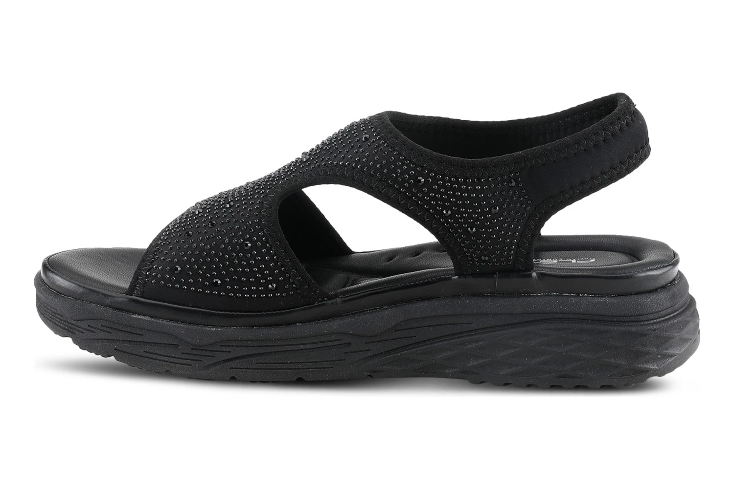 Sporty glitzy sling-back sandal with dainty crystals featuring a soft lycra stretch upper and backstrap that conforms to your foot for ultra-comfort all on a full-length padded footbed and durable sole.