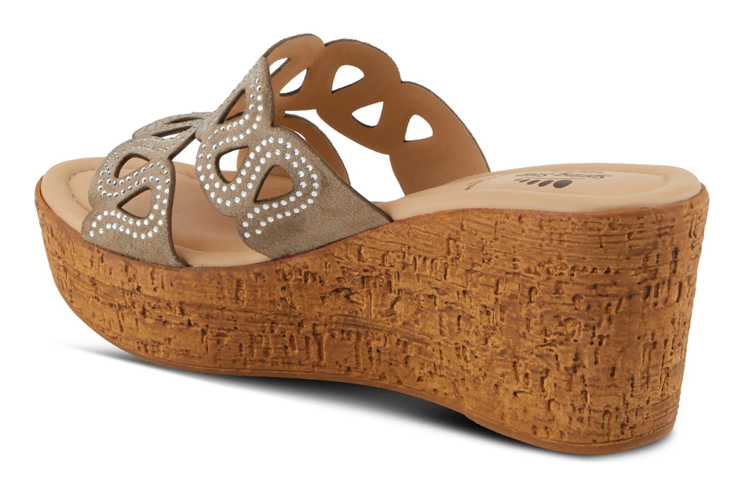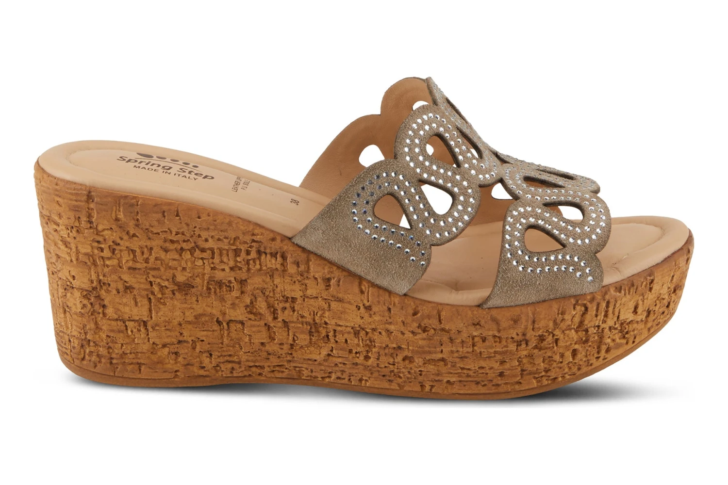 Add a little sparkle to your life with this beautiful crystal upper with open cutouts on a slide wedge giving an elegant feel to a beautiful comfortable sandal. Easy slip-on entry. Made in Italy.