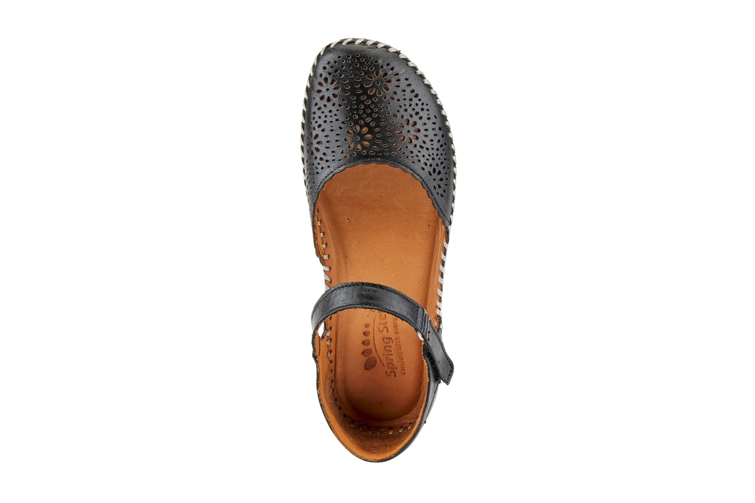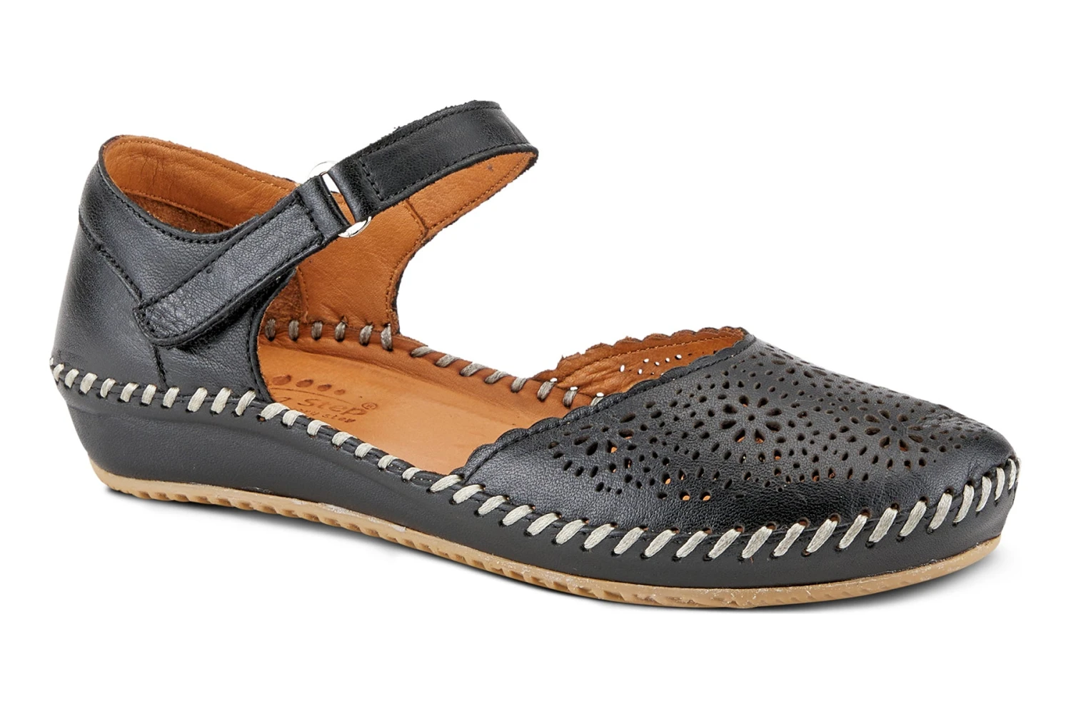 Cute peep toe wedge with an adjustable hook-n-loop ankle strap to securely keep the foot in place on a molded, comfort flexible footbed. As well as a scalloped upper the cutouts help increase breathability and flexibility.